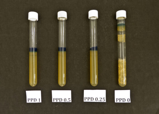 下圖為普維生+©系列產品在強化梭菌培養基下對梭菌的抑菌實驗,使用了巴恩斯和英格拉姆方法的改進。通過菌落和是否產氣來確定梭菌的生長。在建議劑量下(1毫升/升,0.5毫升/升,0.25毫升/升)普維生+©徹底抑制了產氣莢膜梭菌的生長。