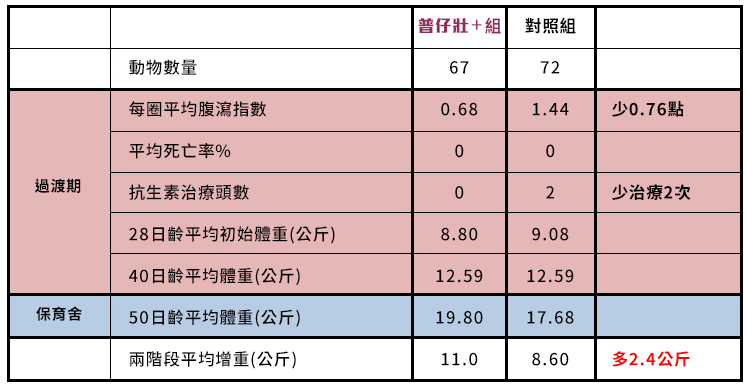實驗開始於28日齡,仔豬進入過渡期(母豬從產房轉走,但是仔豬還會留在產房一段時間)。實驗組在該階段將普仔壯+©添加於小豬開食料中,劑量為1.5公斤/噸。實驗組表現出更好的採食量和外觀(憑經驗判斷),消化系統健康得到改善,因為腹瀉需要的抗生素治療大大減少。