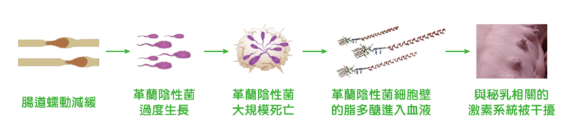 - 腸道菌群遭受嚴重的不平衡,導致母豬荷爾蒙代謝變化。