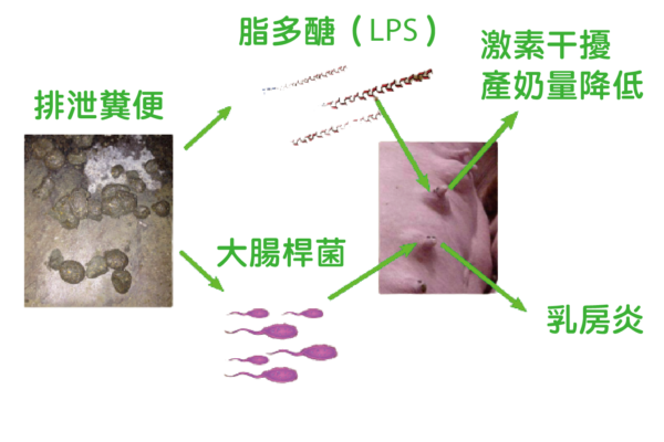 分娩前幾週,糞便中排出的大腸桿菌和脂多醣(LPS)會增加。通過被污染的產床和母豬的皮膚,大腸桿菌會感染到乳房,並增殖形成乳腺炎。脂多醣(LPS)更會污染乳頭,到達乳腺並進入血液,造成激素的干擾,產奶量因此降低。