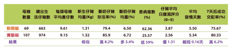 本商業實驗結果在統計上並不顯著,但在各種參數比較中,均顯示出來積極改善的趨勢,也就是:新生仔豬的平均體重和從斷奶到母豬發情的平均天數都有進步。
