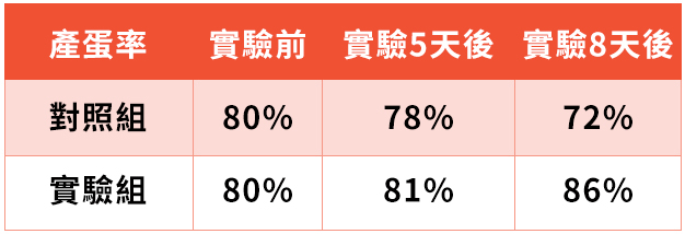 - 實驗組:實驗後第5天,產蛋率增加至81%,第8天增加至86%。