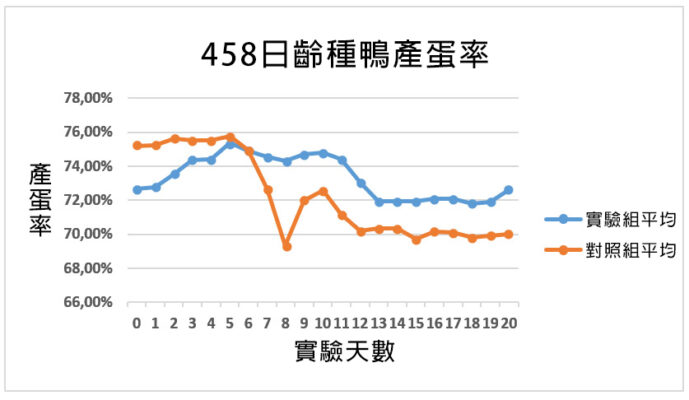 實驗動物為1.3萬隻458日齡蛋鴨,平均分為實驗組與對照組,其中: