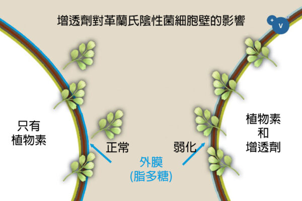 增透劑的作用是使脂多醣層瓦解,同時增加外膜對疏水性物質(如植物素)的滲透性。增透劑本身可能不是抗菌劑,但它們可以與疏水性抗菌劑協同作用以增強其抗菌活性。