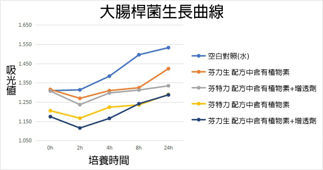 從上圖可以看出,與僅具有植物生長素的配方(吸光值較高)相比,芬力生和芬特力中含有植物生長素和增透劑的配方(吸光值較低)更能有效抑制大腸桿菌的生長。