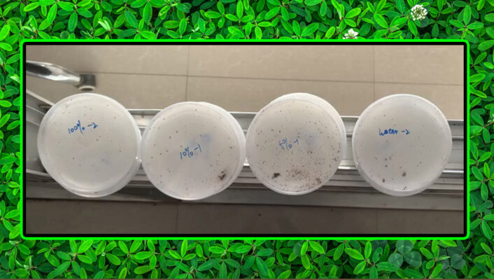 - 培養皿分別標記為5%, 10%, 100%, 水。