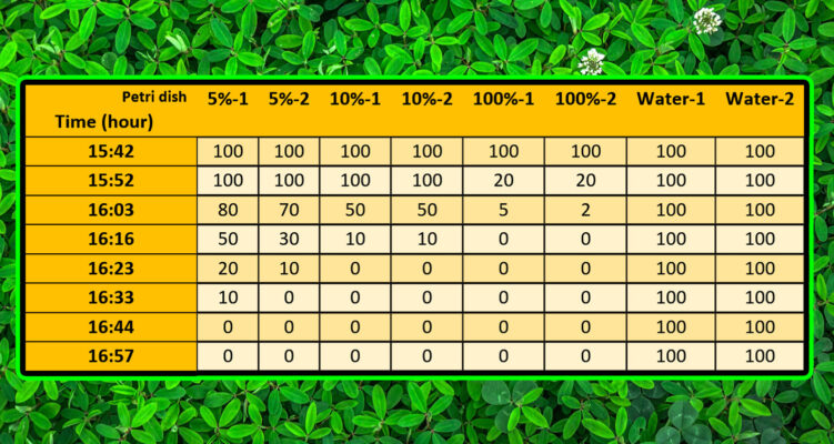 由右表可看出,5%芬必除©溶液能夠在使用後1小時內殺滅兩個培養皿中所有的蟎蟲,10%芬必除©溶液能夠在使用後40分鐘內殺滅兩個培養皿中所有的蟎蟲。
