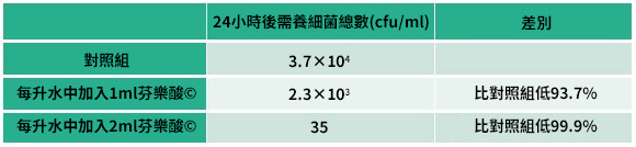 在我們的實驗室中,已經證明了芬樂酸©能夠減少飲用水中的總需氧細菌數量: