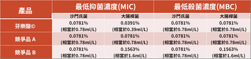 在另一個試驗中,我們發表在2020.05.21《#185 芬樂酸©及兩種競品抑菌和殺菌作用的體外實驗》文章中,芬樂酸©在抑制大腸桿菌方面比其他兩個同類產品更有效,顯示出最低的抑菌濃度和殺菌濃度。