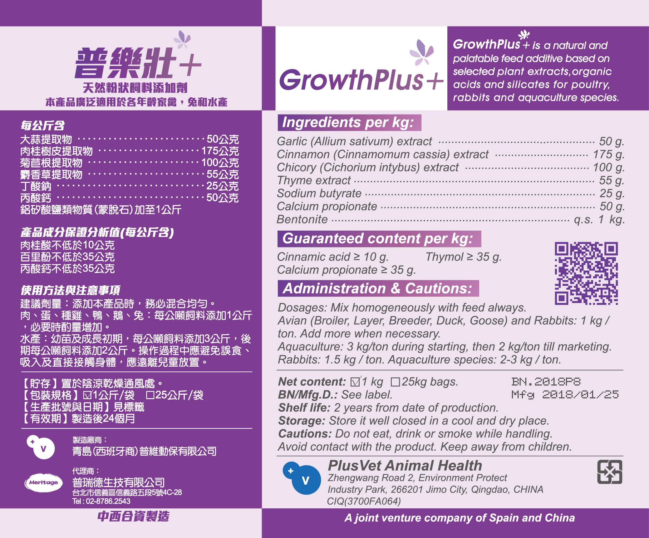 普樂壯+是天然粉狀飼料用添加劑,含藥理性植物提取物,是一種天然的抗生素,廣泛地適用於各年齡家禽和水產,有助於抑制細菌、強化機體對抗病毒的能力,並減少寄生蟲造成的損害,是一種免疫增強劑,有抗真菌、抗氧化,與增加體能的作用。普樂壯+能促進腸道有益菌群生長,使腸道健康發育,促進產能,能應用於取代抗生素作為生長促進劑。配方中更添加了歐洲精選蒙脫石,當飼料中無添加黴菌毒素吸附劑時,可以保障飼料與禽畜的基本安全,若飼料中已經添加黴菌毒素吸附劑,則更可以加強吸附黴菌毒素的能力。本產品對梭狀芽孢桿菌屬,有抑制功能,能夠解決綜合性消化失能的問題(腸漏症),是飼料級的普維生+,兩者相輔相成,可以分別在飼料與飲水中使用。