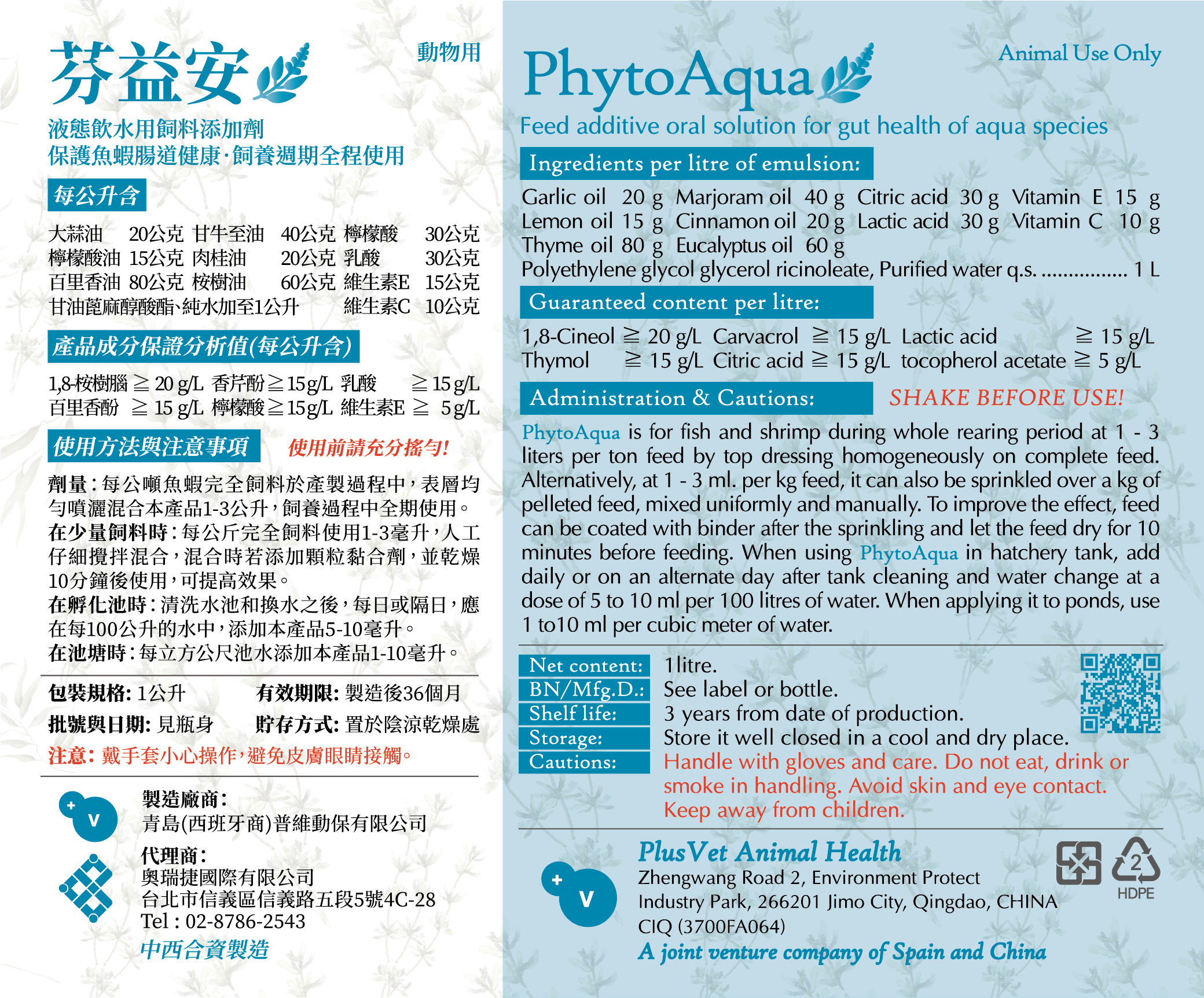 - 每公噸魚蝦完全飼料於產製過程中,表層均勻噴灑混合本產品1-3公升,飼養過程中全期使用。