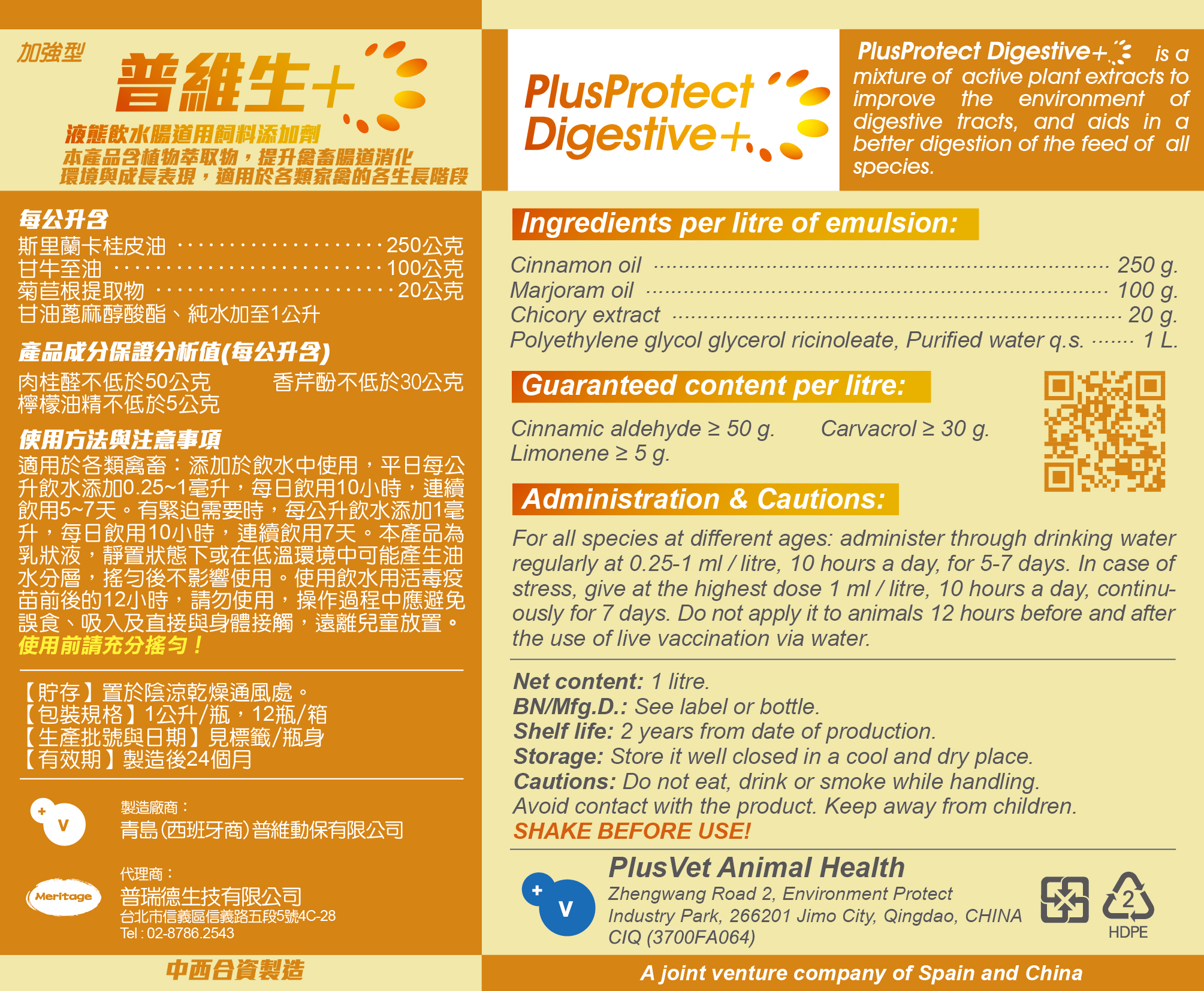 普維生+是液態飲水用產品,含植物萃取精油與植物源益生元,適用於各類家禽的生長與產蛋期。臨床使用證明,能有效地防禦球蟲、大腸菌、沙門氏菌、梭菌、念珠菌和黴菌等可能引起的疾病,是保持腸道最佳環境,建立雞隻腸道有益菌群,提升整場健康和整齊度,取代抗生素,無停藥期、無殘留、無抗、少抗與綠色養殖的最佳選擇。